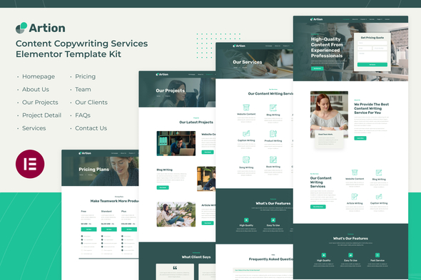 Artion is a modern and clean Content Writing Services Elementor Template Kit created especially for Content Writers, bloggers, Authors, Influencers, or any kind of copywriting services for quickly and easily creating websites for your business using the Elementor Page Builder plugin for WordPress.