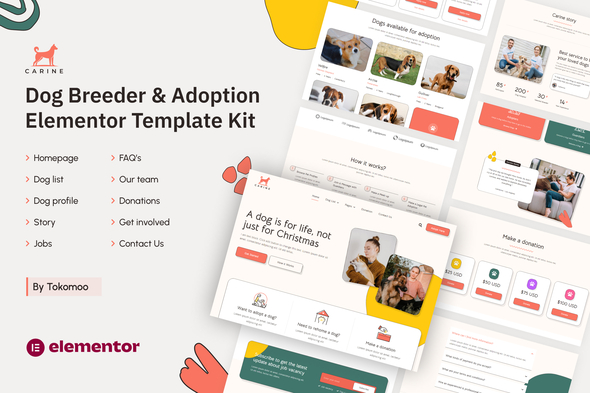 Carine is a modern Dog Breeder & Adoption Elementor Pro Template Kit that perfect for creating a website for dog breeders, dog adoption, kennel, dog care, or any pet care website. This template has a beautiful and unique design with a 100% responsive layout, retina-ready, and easy to customize.
