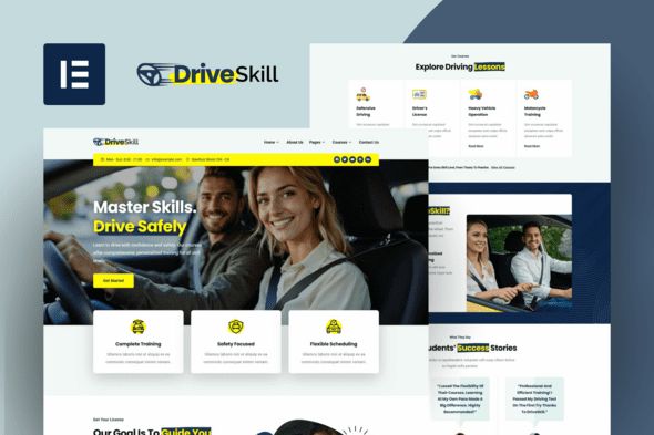 This highly customizable template kit includes a wide range of pre-designed pages, making it easy to tailor layouts, colors, and content to reflect your school’s brand and services. Whether you’re offering motorcycle training, defensive driving, or heavy vehicle operation, DriveSkill provides all the essential tools to promote your courses and connect with new learners.