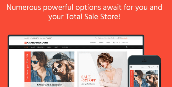 The Grand Discount WordPress theme is ideal for online stores, fashion sites, and other web resources, on which a lot of fashion and clothing items are sold daily on different site sections. This theme easily adapts to the use of custom CSS3 styles. The abilities to customize fonts, colors and header are not all the benefits of the Grand Discount theme. The main advantage of this premium theme is its adaptability. It can be used not only to develop general fashion online store sites, but also to create a fashion blog. This theme is fully compatible with the WooCommerce plugin.