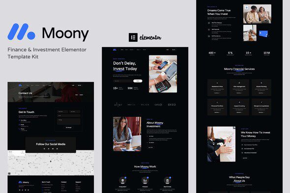 Moony – Finance & Investment Elementor Template Kit built for finance and investment companies. It also works great for other similar business websites. Moony has a simple, modern and clean design with 100% responsive layout, and very easy to customize and can be used by anyone without having to understand coding.