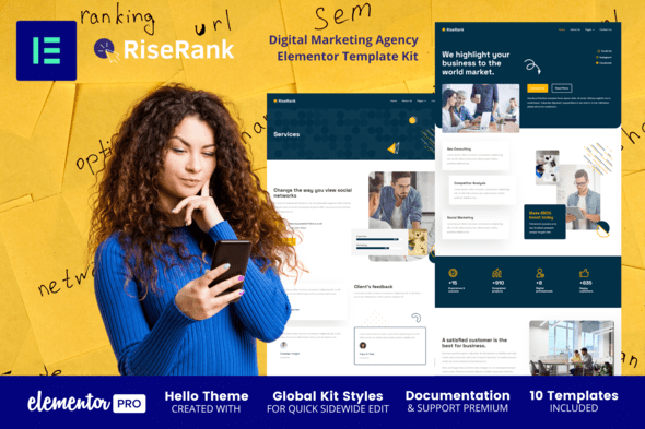 Riserank is an excellent kit for marketing agencies and digital marketing services, it has everything you need to give your website a makeover. With colors and modern design, this kit comes with 10 templates, including the header and footer fully adapted for mobile devices.
