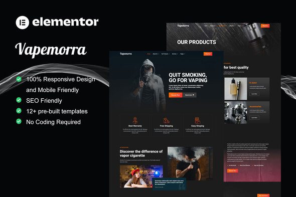Vapemorra is professional Elementor Template Kit for Vape Store. This template kit is perfect for any business or service related to vape, such as vape community & shop, vape store, electric cigarette etc. It has 12+ pre-built templates with clean design and modern style.