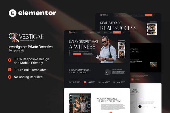 Vestigae is a sleek and powerful Elementor Template Kit tailored for private investigators and detective agencies looking to build a credible and discreet online presence. Perfect for surveillance experts, legal investigation firms, and freelance detectives, this kit allows you to highlight professional services, showcase case study successes, and promote confidential investigative solutions with clarity and confidence. Vestigae uses free elements, so don’t worry about trying this one. Vestigae provides various pages including Home, About Us, Team, Services, Case Studies, Pricing, FAQs, Testimonials, 404, Blog, Contact Us.